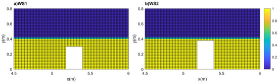 This study simulated cases with and without the submerged structures (WS1 and WS2 for 0.3 and 0.38 m height structures, respectively, and NS for no structure) and no wave case for WS1 (WS1-nw). NS and WS1-nw imply an open-channel flow with and without a submerged structure, respectively. WS1 and WS2 imply flows where the intermediate waves propagate in the flow direction. The lowest wave depth (trough) was located above the structure (WS1) and below the structure (WS2). We characterized the effect of the submerged structure by comparing NS, WS1, and WS2 and that of the waves by comparing WS1 and WS1-nw. Based on the four Eulerian velocity fields (NS, WS1, WS2, and WS1-nw), microplastic particles with different densities (900, 1000, and 1100 ) and sizes (0.2, 1, and 5 mm) were simulated. The 36 cases are summarized in Table 1.
