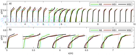 (a) Vertical velocity profiles calculated by the mean velocity fields for NS, WS1, and WS2. (b) Displays enlarged (a). The 0.5 m in the x-axis can be scaled as 1.43 m/s of velocity profiles.