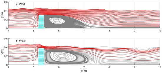 Streamlines for (a) WS1 and (b) WS2. The gray lines indicate streamlines that pass through the points, with 0.025 m spacings at vertical lines at x = 5.46 (just beside the structure), 6 (center of the recirculation zone), and 7.7 m (end of the recirculation zone). The red lines indicate streamlines that pass through the points at the passage above the submerged structure.