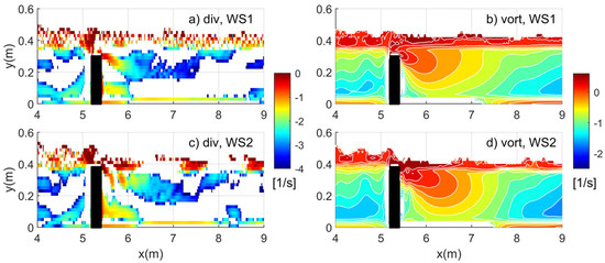 Divergence (a,c) and clockwise vorticity (b,d) in log scale for WS1 and WS2. The submerged structure is marked as black bars. The region of convergence in (a,c) and the counter-clockwise vorticity in (b,d) has no color. The legends indicate the log of divergence and convergence.