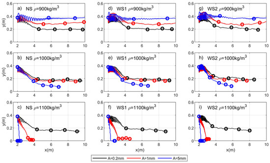The mean trajectories of the 500 particles released near the surface at (x, y) = (2, 0.38) m demonstrated a strong dependency of particle size and density on the mean displacemen (Figure 6). The mean vertical displacement of low-density particles decreased with increasing particle size. In contrast, the displacement of the high-density particles moved closer to the bottom with increasing particle size, as expected. For small particle sizes, the mean displacement displayed no significant differences, remaining at a depth of nearly 0.2 m for all density cases. The mean horizontal displacement significantly changed with particle density. For low-density particles, the mean horizontal displacement upstream (downstream) was the greatest in the case of NS (WS1), but for heavy particles, the greatest displacement upstream and downstream was observed in NS. The effect of installing a submerged structure increased slightly as the particle size and density increased. Hence, the small- and low-density particle cases showed no perceptible difference between the cases with and without the structure. The change in height from 0.3 m (WS1) to 0.38 m (WS2) did not affect the mean trajectories. However, the taller submerged structure (WS2) showed a slightly slower flow speed, resulting in a final horizontal displacement approximately 1 m shorter than that of WS1.