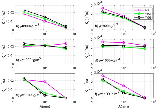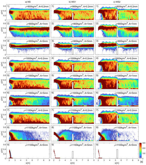 Installing a submerged structure can enhance the horizontal spreading of low-density particles (Figure 8a) but limits the horizontal spreading of high-density particles (Figure 8e). The largest difference between the NS and WS cases was found for heavy- and medium-sized particles ( = 1100 and A = 1 mm in Figure 8e), at which the for NS was approximately four times larger than the for WS cases. The heavy, medium-sized particles settled slowly, owing to the shear dispersion mechanism, and once they reached the bottom, resuspension occurred relatively frequently and advanced intermittently. However, when the structure was met, heavy, medium-sized particles could not pass the structure. This large difference in did not occur for heavy small- and large-sized particles because most particles, in the absence of a structure, swam freely in water regardless of the walls, whereas most particles were stuck to the bottom without any resuspension when structures were included.
