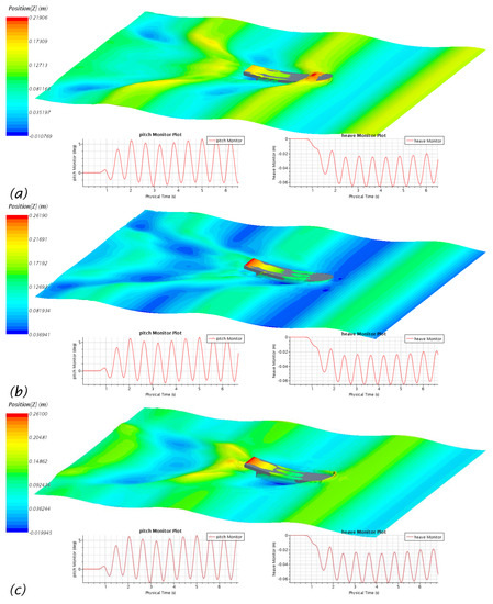 Figure 7 shows the simulation results in the state of the head sea as , , and . The encounter cycle with the head waves is divided into four stages: , , and . In the pitch motion, the downward movement corresponds to (+) values; the upward movement corresponds to (−) values. During the pitch motion in which the bow rises the most, the heave makes an upward motion (Figure 7a); in the situation where the bow goes down the most, the heave makes a downward motion (Figure 7c).