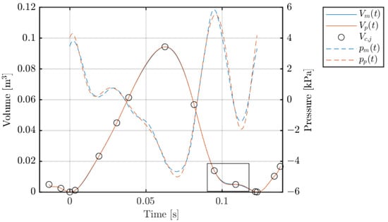 The following sections deal with different types of pressure and cavitation volume time signals in order to distinguish the indices that are used to address each entity individually. Signals and signal sequences from the original pressure measurement are indexed with m, such as a continuous signal or the ith sequence cut from the original measurement. The volume signal modelled with the polynomial function described in Section 2.3 is denoted with p and with an additional for the randomly manipulated sequences, e.g., . The control points of the polynomial function as pairs of time and volume are denoted with c and numbered with j. The mean volume signal shown in Figure 1 is referred to as .