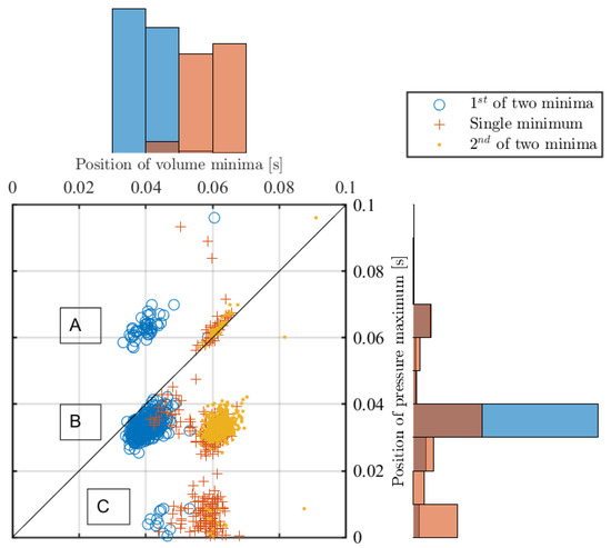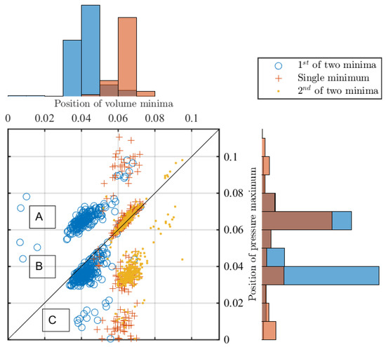 Position of the pressure maximum in relation to the position of the volume minima for all passages at 96.5 rpm. The passages are distinguished by the number of volume minima (1 or 2—upper histogram) and by the position of the pressure maximum (groups A, B, and C—right-hand histogram). The colour code of the histograms refers to the marker colour of the centre plot.