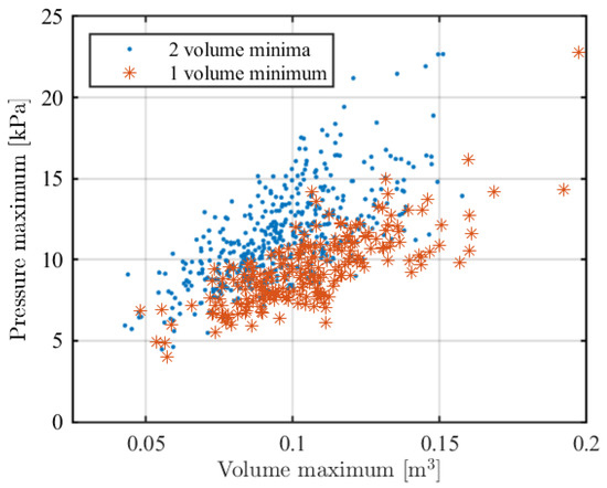 The distinct separation between passages with a single or a double volume minimum in Figure 3 and Figure 4 provides an additional criterion for the identification of shape parameters. The upper histograms show that the two types occur equally often. Figure 5 shows that passages with a double minimum tend to produce higher pressure peaks than those with a single minimum. A similar distribution is found for 87.5 rpm. This emphasises the influence of the collapse region that is outlined in Section 3.1. Additional to the influence of the number of volume minima, it allows also the conclusion that an increasing volume amplitude itself also tends to increase the corresponding pressure peak [13].