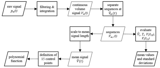 while and X represent the above four parameters for clarity whose calculated values are listed in Table 3. A –test is performed to ensure the correct assumption of normal distributions. The values of agree with the corresponding features of the mean signal , whose polynomial model is used as a basis for the generation of randomly varied sequences (Section 2.5). Only the height of the 11th control point is overestimated by the stochastic analysis in comparison to the mean signal. The normalised standard deviation is found to be of equal size in each measuring conditions. The entire process from the raw signal to the manipulable model is displayed schematically in Figure 6.