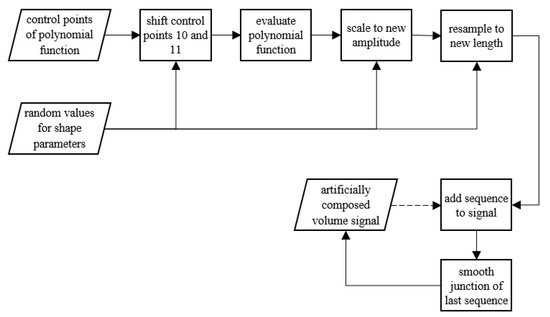 Schematic process of the Monte Carlo simulation comprising the individual sequence manipulation and the composition of the artificially varied volume signal.