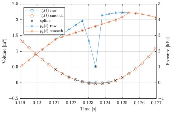 As mentioned in Section 2.3, the junction between the sequences is a source for discontinuities, especially in the pressure signal which is proportional to the second derivative of the cavitation volume. In order to provide a continuous pressure signal for the spectral analysis, differentiability class C2 is needed for the volume signal. Since the mean signal starts and ends with zero values, which are unchangeable by the scaling according to Equations (5) to (11) only C0 continuity is provided by the lining-up itself. It leads to artificial distortions of the derived pressure signal as visible in the blue line of Figure 8. Ideally, C∞ would ensure that no additional broadband component is created. However, this would require a significant number of samples of both adjacent sequences to be manipulated to obtain a smooth transition changing the actually desired features of each sequence. Therefore, C2 continuity is chosen as a balance. Adjustments of the curvature (by polynomial control points before and after the actual sequence time span) do not guarantee a smooth transition between the sequences. Therefore, after each amendment of the artificially composed signal by the next manipulated sequence the last four sample points on either side of the junction are deleted and recalculated by spline interpolation for the respective time samples. The spline creates a C2 connection between the volume sequences. The effect of this smoothing is shown in the orange lines in Figure 8.