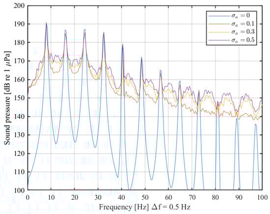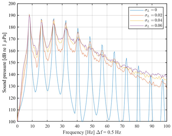 The sequences leading to Figure 10 vary only in their length. The continuous signal of the lined-up blade passage corresponds to a varied blade passing frequency, e.g., due to variations of the propeller shaft speed presented in [13]. The initially clean harmonics of the unvaried signal transform into broader peaks with increasing standard deviation. This effect is known as smearing [23]. In particular, the second and higher harmonics resolve increasingly into the rising broadband part of the spectrum, which is also in agreement with the literature. However, the linear increase of the broadband component with the frequency, which is outlined in [11], is difficult to distinguish. The smeared harmonics appear to ‘loose’ their energy into the surrounding broadband component.