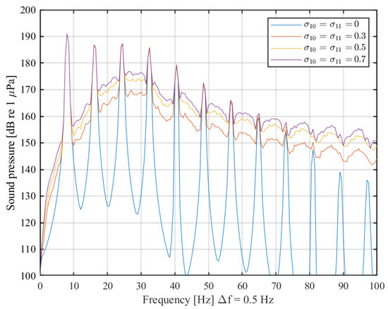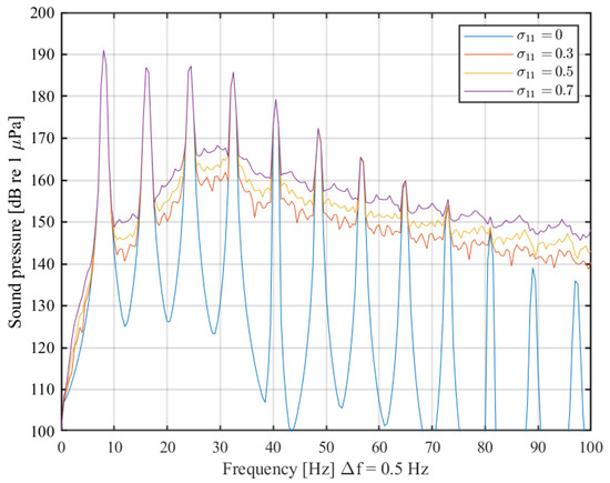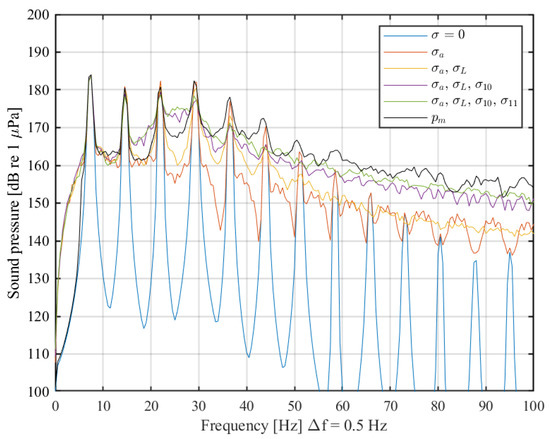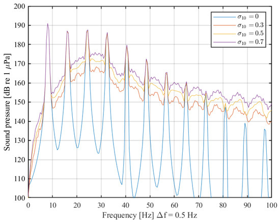 Figure 9 shows the resultant spectrum for an isolated variation of the volume amplitude with three different standard deviations controlling the generation of random factors . As described in previous studies [11] the amplitude variation generates a broadband component in the spectrum that is roughly constant over the whole frequency range. With increasing the broadband component can be observed to detach itself from the loop-shaped broadband component of the clean signal and follow a line parallel to the harmonics. The peaks of the harmonics of the repetition frequency, i.e., the blade passing frequency remain almost unchanged. Given the significantly lower loops of the clean signal, the effect of the C2 differentiability class of the volume signal at the sequence junctions discussed in Section 2.5 is confirmed to be negligible. The smoothing process by spline interpolation mitigates the patching disturbances sufficiently.