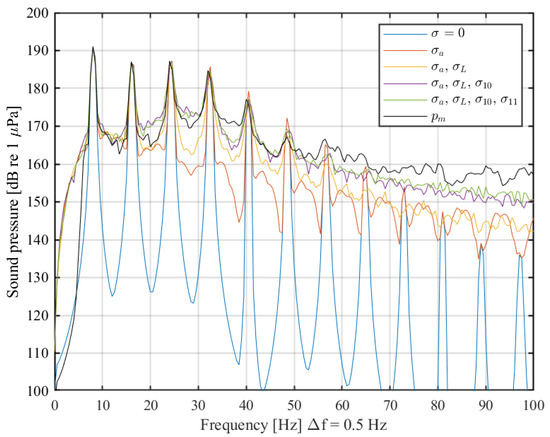 Sound pressure spectra of artificial signals generated by variation of all four shape parameters taking effect successively based on standard deviations evaluated from the measured blade passages as stated in Table 3 for 87.5 rpm in comparison to the unvaried signal (blue) and the measured signal (black).