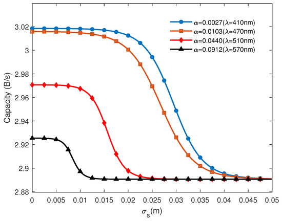 - Matta, G.; Pandey, P.; Agrawal, M.; Bahl, R. Capacity analysis of underwater visible light communication systems over a lossy channel in the presence of noises. J. Opt. Soc. Am. A 2022, 39, 948–958. [Google Scholar] [CrossRef]
