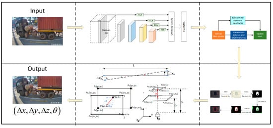 The proposed visual measurement algorithm includes three parts: the tracking network, based on detection, the target secondary positioning network and the three-dimensional measurement algorithm. The detection-based tracking network is divided into two parts: target detection and target tracking. The target detection network uses a convolutional network structure and introduces an attention mechanism to improve the ability to extract keyhole features. The tracking part uses the simplified Deep SORT [] (Deep Simple Online and Realtime Tracking) to predict the trajectory of the keyhole target in subsequent frames and calculates the Mahalanobis distance and GIOU (Generalized Intersection over Union) distance of the detection frame and the tracking frame for data association to obtain the keyhole tracking trajectory. The target secondary positioning network uses the traditional image detection algorithm to perform secondary positioning of the container keyhole on the basis of target detection and tracking, and obtains the accurate position of the container keyhole. The three-dimensional measurement algorithm uses the camera imaging principle to measure the three-dimensional attitude of the container keyhole to estimate the container attitude, so as to realize the three-dimensional measurement of the container loading and unloading process. The overall flowchart of the algorithm is shown in Figure 3.