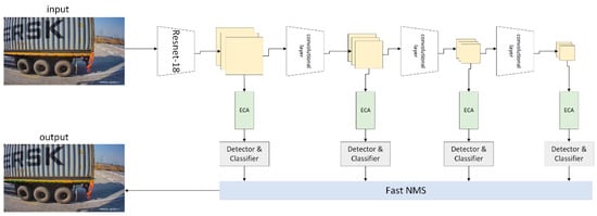 R-E-SSD network structure. ECA-Net, a lightweight and efficient channel attention module, ensures the neural network focuses on certain channels with large weight values, and resnet-18 provides the feature extraction backbone network.