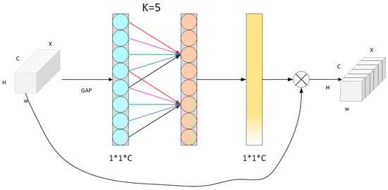 Among them, represents the odd number close to the result, and , represent constants, which are 2 and 1, respectively. The structure diagram of the ECA-Net network model is shown in Figure 5.