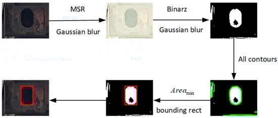 It can be seen from the binarized image that, although Gaussian filtering removed a lot of noise and retained the container keyhole area, there were still shadows on the edge of the lock and the interior of the keyhole. In order to avoid the interference of other parts on the positioning of the container keyhole, all of the closed contour in the binarized image, was found and all the closed contour area was calculated. The area of the closed contour was compared and the closed contour represented by the MAX of the maximum area was found to be the outer contour of the container keyhole. Finally, the minimum circumscribed rectangle was used to fit the container keyhole contour to achieve the accurate positioning of the container keyhole.