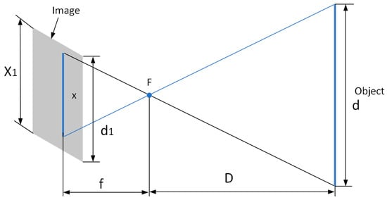 If the distance , between the measured object and the focal point of the camera, is known, then is proportional to ; that is, , where is defined as the conversion factor between the pixel size and the actual distance. Under ideal conditions, the conversion factor in the horizontal direction of the image is the same as that in the vertical direction, that is, :