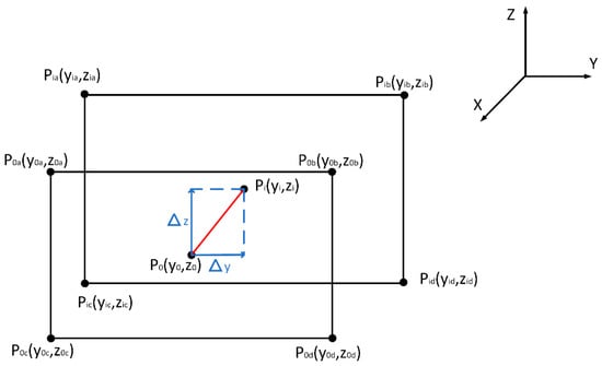 As shown in Figure 10, the offset distances of the container keyholes in the Y and Z directions refer to the moving distances in the Y and Z directions between the detected container keyhole center position and the initial position . According to the secondary positioning of the container keyhole mentioned above, the central positions and of the container keyhole in the initial state and time can be obtained. The initial position of the container from the camera is known, and the proportional relationship between the pixel size of the container and the actual distance in the initial state is obtained according to the camera imaging principle, and after the secondary positioning, the center position of the container keyhole is obtained, so the container keyhole is in the Y direction and the Z direction. The offset distances and in the direction are given by the following relation (11):