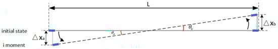 As can be seen from the above figure, once the container is deflected, the imaging size of the container corner piece collected by the camera also changes in the image. According to the Formula (13), the container keyhole-a and keyhole-b move at the time compared to the initial state. The distances are and , and the length of the container is . Firstly, the deflection angles and on both sides of the container keyhole a and b are calculated. The schematic diagram and specific calculation of the offset angles , and of the container relative to the initial state at time are shown in Figure 13.