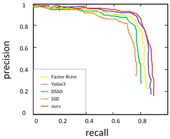 P-R curve, Yellow is the PR curve of Faster-RCNN; purple is the PR curve of YOLOv3; green is the PR curve of DSSD; orange is the PR curve of SSD; red is the PR curve of our algorithm.