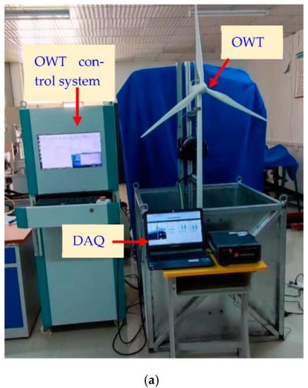 The blades were driven by a motor connected to a power amplifier and an upper PC. The control software was composed to adjust the rotating speed of the blades. The rotation speed of the OWT was set to 75 r/min if nothing else was mentioned.
