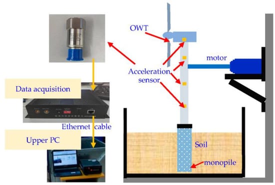 The data acquisition system mainly consisted of four acceleration sensors and a data acquisition unit. The specific parameters of the acceleration sensors are listed in Table 1. Those acceleration sensors were evenly distributed along the height of the OWT. The data acquisition unit was an 8-channel multi-signal collector developed on the basis of an STM32 chip. Its parameters are listed in Table 2. The data acquisition unit was connected to the upper PC via an ethernet cable. The aforementioned RDT-SSI algorithm was composed using Python language. The sampling frequency in this study was set to 50 Hz.