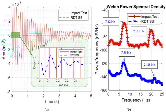 Comparison of impact test and RDT result: (a) time-domain result and (b) frequency-domain result.