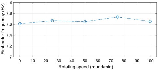 The experimental results shown in Figure 7 were recorded while the OWT was stopped. The first-order frequency was also estimated when the blades were rotating at different speeds. The experimental results suggested that the frequency varied little when at those speeds. This can be attributed to the fact that those speeds (0~100 round/min) were far away from the first-order frequency. Therefore, in the following study, the rotating speed was kept at 75 rounds/min.