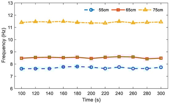 In this study, the OWT was buried at different depths (55, 65, and 75 cm) to simulate the scouring phenomenon. For each embedment depth, the OWT was operated for one hour, and its frequency was reported by the proposed method every 20 s. Figure 8 shows the frequencies between 100 s and 300 s. As can be observed in the figure, the average frequencies of the three embedment depths are 7.61, 8.41, and 11.33 Hz, respectively. The experimental results indicated that the frequency of the OWT increases with the increment of the embedment depth. This can be attributed to the additional restraint of the surrounding soil. Therefore, the proposed RDT-SSI can be used to preliminarily monitor the status of the OWT foundation.