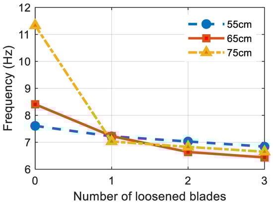 The blades of an OWT are subjected to strong wind during the OWT’s service life. The bolt at the root of the blades becomes loosened after continuous wind loads. In this study, the bolts of the blades were loosened from 450 Nm to 270 Nm (a decrement of 40%) to investigate the influence on the dynamic property of the OWT. Table 3 and Figure 9 summarize the identified frequency of the OWT with varied embedment depth and numbers of loosened blades. It can be observed from the figure that the frequency of the OWTs decreased when the blades were loosened. This trend can be explained: after a certain time of working, the looseness of the bolts weakens the restraint of the blades, thus, reducing the stiffness of the whole structure. It can also be observed in Table 3 that, when more blades were loosened, the variance of the estimated first-order frequency tends to increase. This trend can be further investigated in the future with additional devices.