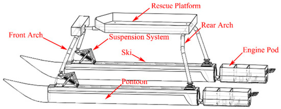 The rescue vessel consists of a rescue platform, a front arch, a suspension system, two pontoons, a rear arch, and an engine pod, as shown in Figure 1. Between the front arch and the pontoon, a suspension system is added. The front arch is connected to the rescue platform and the suspension system by spherical joints, and the rear arch is connected to the left and right pontoons by articulation joints with rotational degrees of freedom in the horizontal and vertical planes, which constitute the articulated system of the vessel.