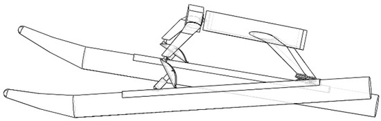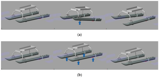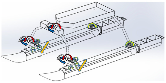 In contrast to traditional vessels, although the vessel has two demihulls contacting with the water surface, the strong frame connecting the two demihulls is not a whole rigid body structure, but rather is articulated by multiple rigid body components, so the seakeeping performance of the vessel is affected not only by the key parameters of demihulls but also by the multi-body dynamic of the articulated structure shown in Figure 3. The whole mechanism is connected by three spherical joints, which are located between the front arch and the main hull, and between the front arch and the left and right suspension mechanisms. The spherical joint connections only limit the displacement motion in three directions and do not limit the rotation motion. When one side of the demihull encounters the sea wave, the other demihull can adapt to the undulating motion of the sea wave instead of the intense collision of the traditional vessel. The rear arch sections are rigidly attached to the rescue platform but are allowed to rotate relative to each pontoon in pitch [27].