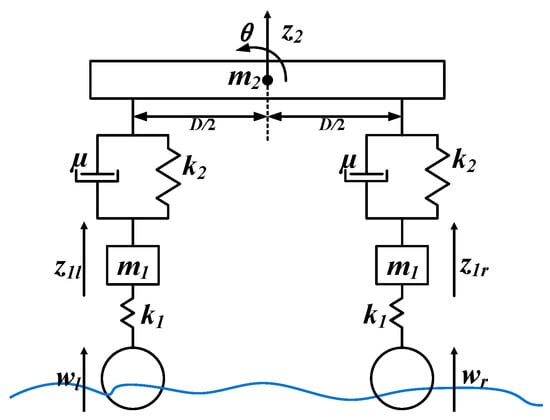 In the actual use of rescue vessels, heave motion and roll motion have the greatest influence on the seakeeping performance, so the motions of the pontoons and roll motion are added to form the four-DOF model shown in Figure 4, based on the single-DOF model proposed by Manhar R. Dhanak [28]. k1 and k2 are the equivalent stiffness coefficients of the flexible pontoon and suspension system. μ is the equivalent damping coefficient of the suspension system. wl and wr are the displacement excitations of the waves for the left and right pontoons in the vertical direction, respectively, z1l and z1r are the displacements of the left and right pontoons in the vertical direction, respectively, z2 is the displacement in the vertical direction of the center of mass of the rescue platform, and θ is the roll angle of the rescue platform.