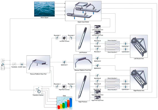 In a time domain simulation, the states of each rigid body can be classified by their respective positions and velocities [32]. The determined displacement or velocity is input from the signal input module so that the pontoon has a certain motion. Then the suspension system is squeezed or stretched, and the impact is finally transmitted to the rescue platform through the buffering and absorption of the suspension system. The whole vessel model is shown in Figure 6, in which parameters such as the mass and moment of inertia of the parts are calculated according to the model. The motion responses of the rescue platform are detected by the Transform Sensor, and these responses are the heave motion, the pitch motion, and the roll.