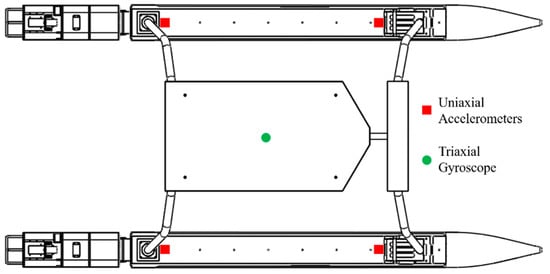 The installation position of the sensor in the experiment is shown in Figure 8. The 16 g accelerometers are oriented vertically and mounted on top of the pontoon skis to measure the vertical acceleration data. This is consistent with the position of the excitation point in the simulation model. A single tri-axial 16 g gyroscope is mounted on the sprung mass close to the center of mass in the rescue platform to measure the vertical acceleration, roll, and pitch angles with the position of the motion measurement point in the simulation model. An Advantech USB-4711a acquisition card is selected as the data acquisition card.
