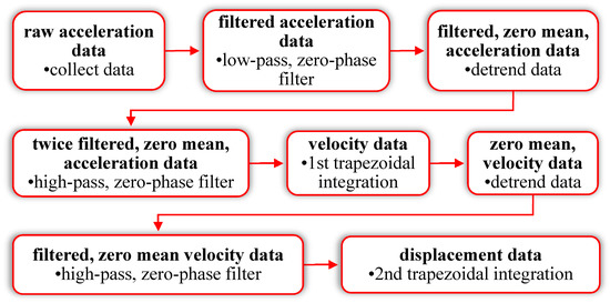 Before the measured accelerometer data can be used as inputs of the simulation model, first the data have to be transformed into global vertical displacements. Transforming the data requires two separate integration procedures. Due to the limitations of the frequency domain integration, integrations are performed in the time domain. Integration in the time domain is more accurate at lower frequencies to analyze the dynamics of the rescue vessel [33]. To obtain usable outputs from the data, the data need to be preprocessed before integration to minimize potential errors. To remove the offset due to gravity from the raw data, the average acceleration of the data set is calculated and subtracted from each data value to detrend the data. The high-frequency engine noise is removed from the data through the use of a low-pass filter, set at 30 Hz to avoid interference occurring at lower frequencies of the ocean inputs. Finally, a high-pass filter with a low cutoff frequency of 0.35 Hz is used to eliminate small artifacts in the data that can lead to moving means once integrated [34]. A zero-phase filtering approach is implemented to eliminate any temporal shifts due to the filtering scheme [35]. The filtered accelerometer data are available to perform integration operations. A cumulative trapezoidal integration scheme is used to generate the velocity data. The velocity data are processed again using the same zero-phase filter and trapezoidal integration scheme to obtain the global displacement data as a function of time. The entire process of converting the raw acceleration data into usable displacements is shown in Figure 9.