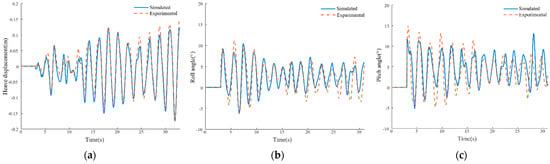 Comparison of simulated and experimental data. (a) Heave displacement; (b) Roll angle; (c) Pitch angle.