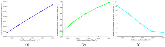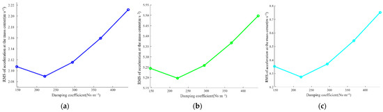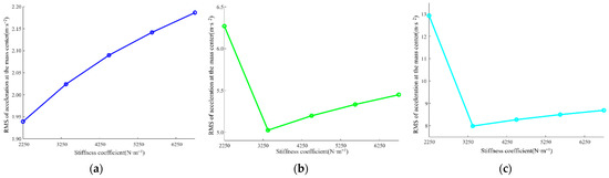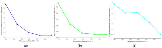 The corresponding stiffness value and the damping value for the simulations are listed in Table 2, and the acceleration root mean squared value at the mass center of the rescue platform is shown in Figure 12. From the simulation results, with the different amplitudes of the wave impact, the influence of the damping change on the response of the rescue platform is consistent, and damping coefficients that are too small and too large are unfavorable to motion mitigation. When the damping value is 221 Ns·m−1, the root mean square value of the acceleration at the mass center of the rescue platform is the minimum, and the dynamic stroke of the suspension system does not exceed the maximum stroke, so the damping value of 221 Ns·m−1 is used as the reference value for the following stiffness coefficient study.