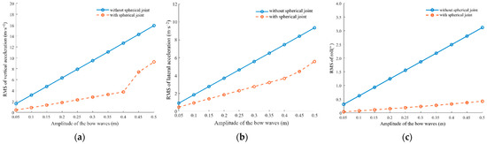 Seakeeping criteria values with and without spherical joint. (a) RMS of vertical acceleration; (b) RMS of lateral acceleration; (c) RMS of roll.