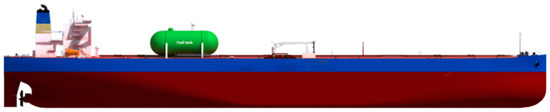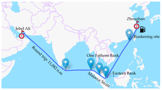 Table 1 presents the main parameters of the VLCC. Figure 1 shows the side view of the ship. The shipping route of the VLCC was from the Middle East to China, as shown in Figure 2. The loading port was Jebel Ali, and the unloading port was Zhoushan. The voyage of a round trip was 11,082 nautical miles (n.m.). Only one bunkering operation was conducted for each round trip. The ship was bunkered at anchorage in the Port of Zhoushan via ship-to-ship transfer.