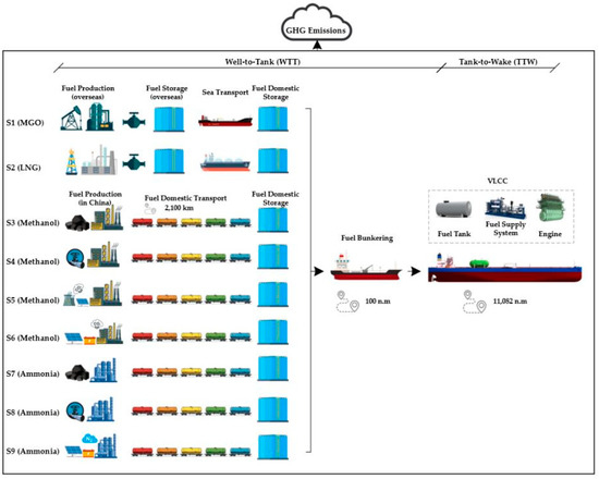 To better understand the emissions, various fuel production pathways were considered. As the ship bunkering site was considered to be the Port of Zhoushan, China, from the status quo of China’s energy supply [31], the MGO and LNG were considered imported from overseas, and methanol and ammonia were considered produced in China. Given that green methanol and green ammonia production have not yet been scaled up, grey productions, as transitional pathways, were also considered. It was assumed that the methanol and ammonia production factories were located in northwest China, where coal, natural gas, and solar energy resources were abundant [32]. The systems were thus split into nine subsystems: