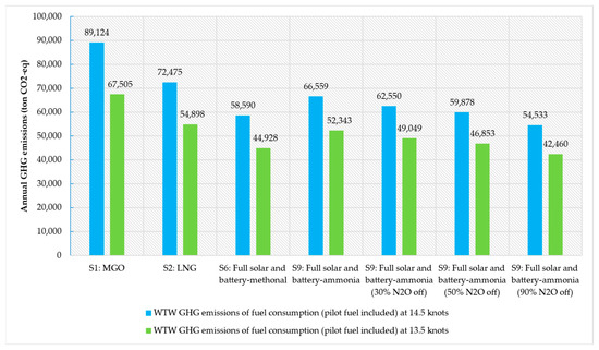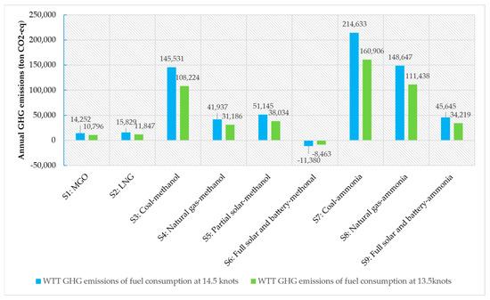 Figure 4 presents the annual WTT GHG emission results of subsystems S1–9. The WTT GHG emissions of fossil energy-based methanol and ammonia were significantly higher than those of fossil fuels, MGO, and LNG. Methanol emissions based on partial solar energy were also not competitive. Only methanol produced using a full solar and battery process had obvious advantages as its production process absorbed CO2 as a feedstock and led to net negative emissions.