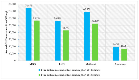 Figure 6 presents the annual TTW GHG emission results of the VLCC. First, the emission reduction effect of reducing speed was noticeable. Taking MGO for example, when the ship sailed at an economical speed of 13.5 knots, it reduced emissions by 24.26% compared to when it sailed at a service speed of 14.5 knots. Using alternative fuels shows varying degrees of advantages compared to MGO. At the speed of 14.5 knots, using LNG could reduce emissions by 24.73%, using methanol could reduce emissions by 7.94%, and using ammonia could reduce emissions by 73.68%. At the speed of 13.5 knots, using LNG could reduce emissions by 24.57%, using methanol could reduce emissions by 7.60%, and using ammonia could reduce emissions by 70.06%.