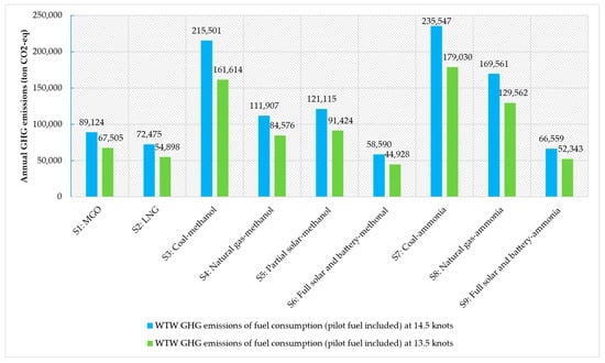 Figure 7 presents the annual WTW GHG emission results of the VLCC. Fossil fuel-based methanol (S3 and S5) and ammonia (S7 and S8), and partial solar-based methanol (S5) had no emissions reduction effect. Compared with MGO, under the service speed of 14.5 knots, using LNG could reduce emissions by 18.68%; using full solar and battery-based methanol could reduce emissions by 34.26%; using full solar and battery-based ammonia could reduce emissions by 25.32%. Under the economical speed of 13.5 knots, using LNG could reduce emissions by 18.68%; using full solar and battery-based methanol could reduce emissions by 33.44%; using full solar and battery-based ammonia could reduce emissions by 22.46%.