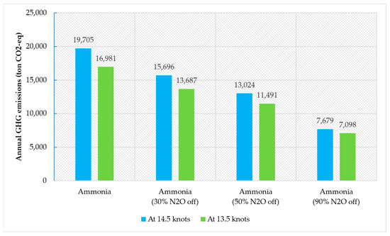 Annual TTW GHG emissions of using ammonia considering N2O abatements.