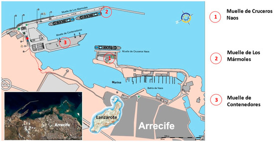 There are several docks where cruise ships can dock (Figure 1): Muelle de Cruceros, Naos, Mármoles, Prolongación de Mármoles, Transbordadores Poniente and, in the event of an emergency or last-minute request for a stopover in an exceptional situation, Transbordadores Naciente, provided that it is not occupied by container ships.