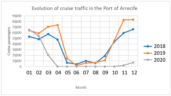 Figure 2 clearly shows the evolution of cruise ship traffic throughout the year in the Port of Arrecife. Furthermore, it can also be seen that in 2020, with the start of the pandemic caused by COVID-19, traffic came to a standstill from March onwards and by the end of the year it was growing slightly. In 2021 it was not able to recover 100% of its capacity, due to restrictions and measures that still had to be carried out.