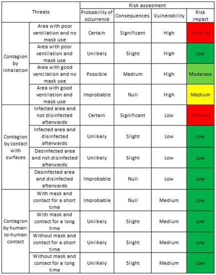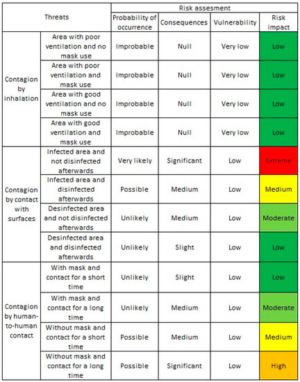 Probability of occurrence of the threat: Unlikely: contagion does not occur in the process (0%). Unlikely: rarely occurs but can happen (0–30%). Possible: infection occurs in isolated cases (30–60%). Very likely: contagion occurs frequently (60–90%). Safe: contagion always occurs (90–100%).