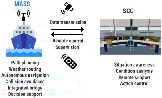 The transition from manned to unmanned and autonomous shipping is expected to be gradual, with a lot of modifications; for this reason, it is important to precisely define levels/classes of autonomy. The International Maritime Organization (IMO) has defined the following four degrees of autonomy (DoA) related to maritime autonomous surface ships (MASS) [17], covering the transition from a ship with automated processes and decision support to fully autonomous ships capable of making decisions and determining actions by itself. The transition phase between these two are remotely controlled ships with and without crew onboard. Progress in the development, testing, and simulations of autonomous and unmanned commercial ships begin in the late 2000s, displaying numerous opportunities for maritime community [18]. Autonomous shipping brings a unique value for addressing many crucial maritime challenges [19]. Research platforms and concepts such as MUNIN [20], Yara Birkeland [21], ReVolt [22] and Rolls-Royce [23] have revealed fundamental differences in the design and technical specifications of autonomous ships, which will have important ramifications on how commercial vessels are designed in the future [24]. It is recommended that the autonomy for fully unmanned ships be constrained, either under supervision or under the control of a shore control centre (SCC) [25]. In Figure 2, the relation between MASS and shore control centres (SCC) is shown.